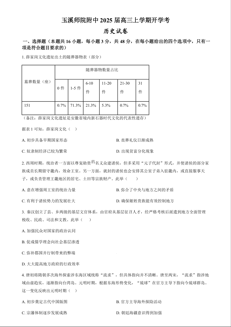 云南省玉溪师范学院附属中学2024-2025学年高三上学期开学检测 历史