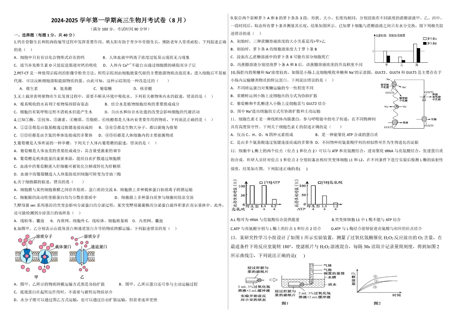 新疆石河子第一中学2024-2025学年高三上学期开学考试 生物