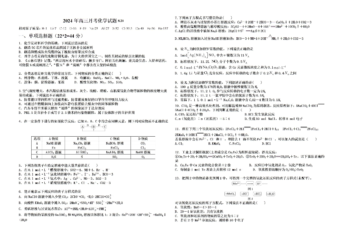 新疆石河子第一中学2024-2025学年高三上学期开学考试 化学