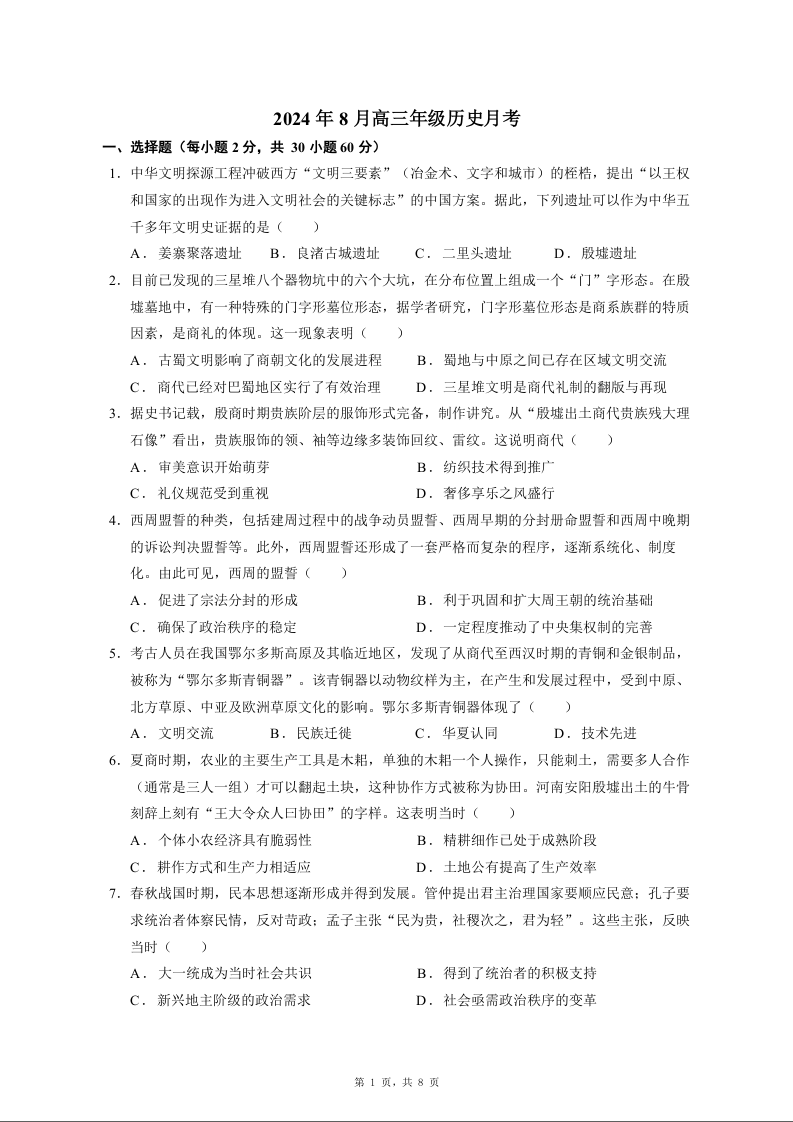 新疆石河子第一中学2024-2025学年高三上学期开学考试 历史