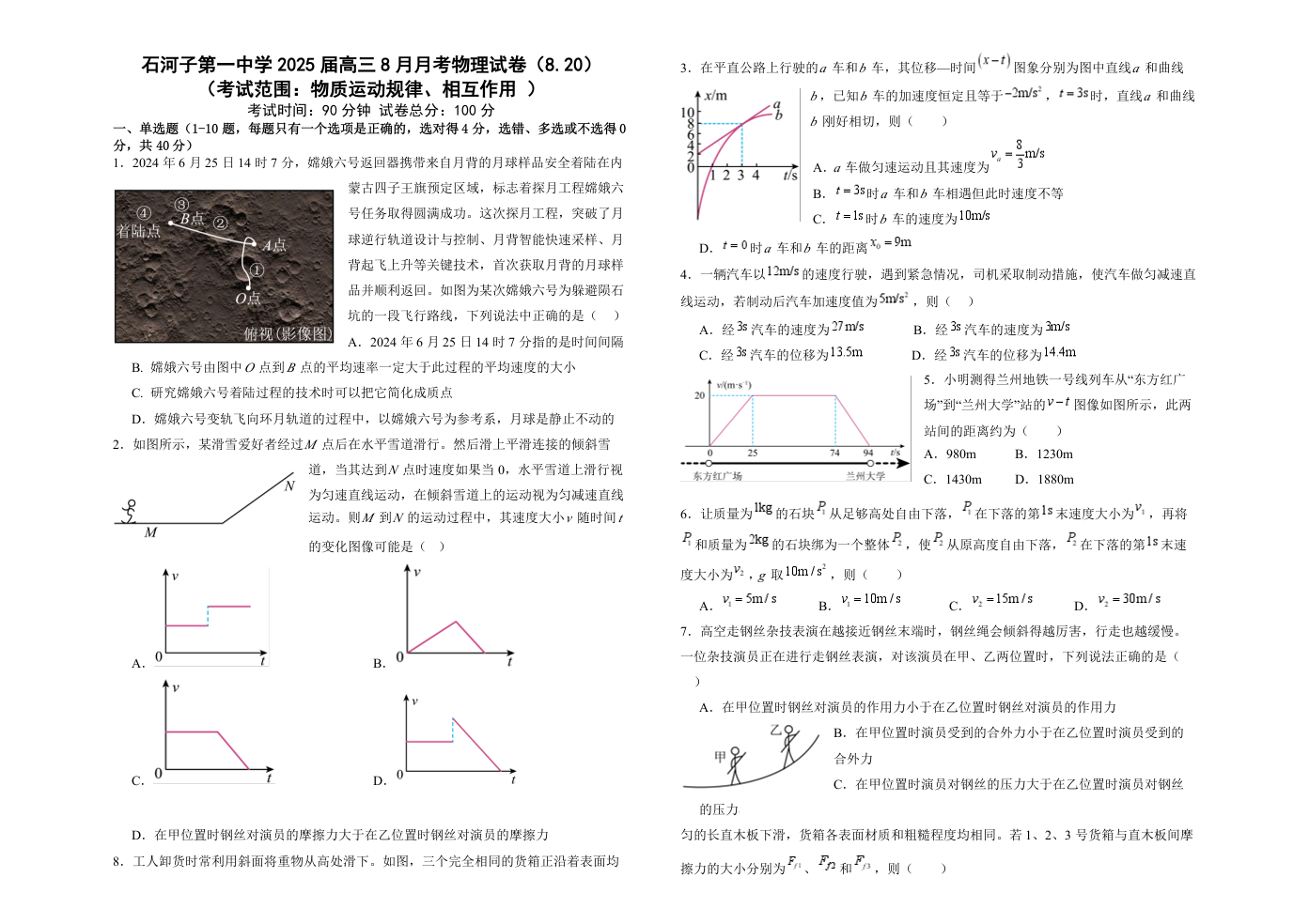 新疆石河子第一中学2024-2025学年高三上学期开学考试 物理