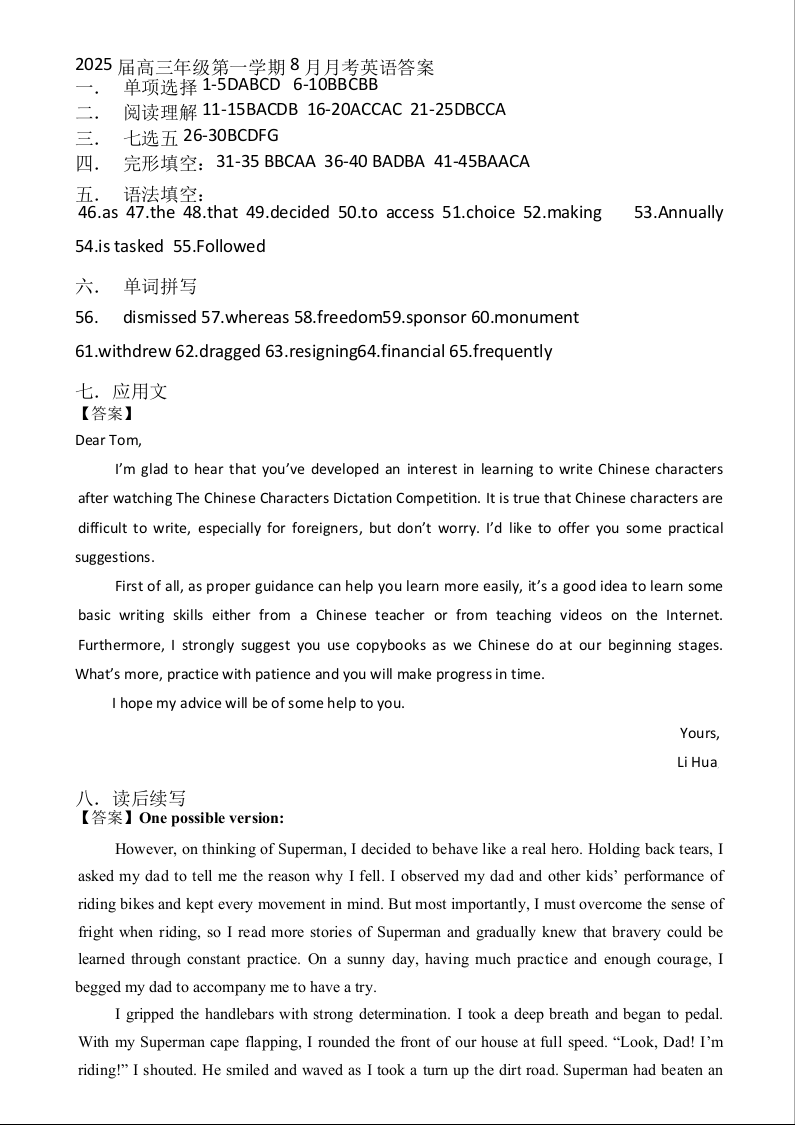 新疆石河子第一中学2024-2025学年高三上学期开学考试 英语答案
