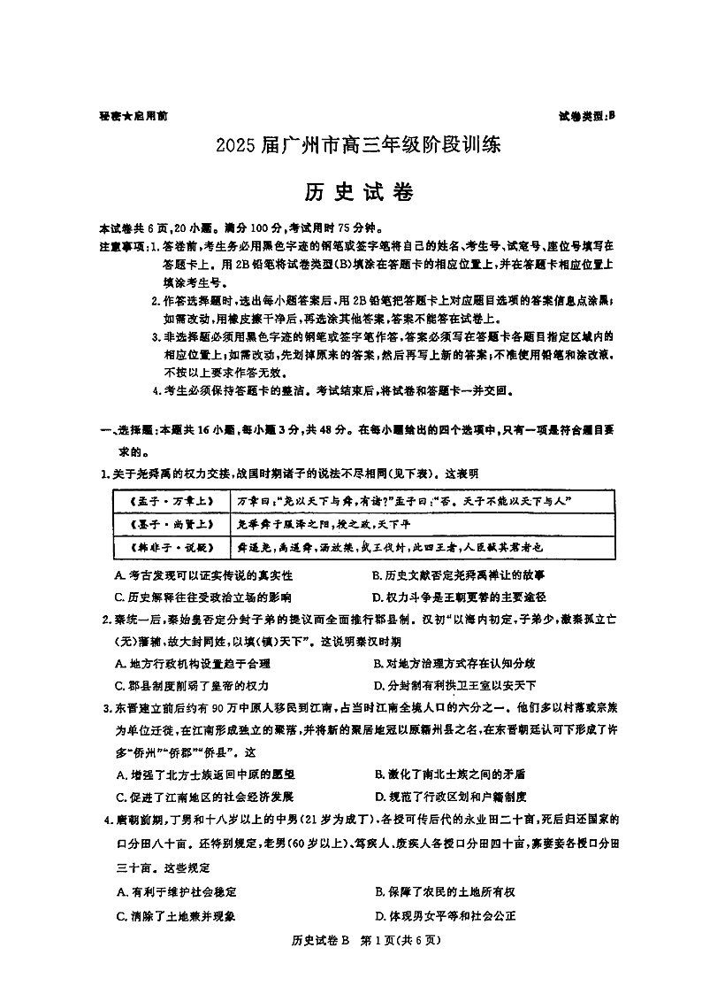 广东省2025届广州市高三年级阶段训练暨8月摸底考试(市调研考)历史