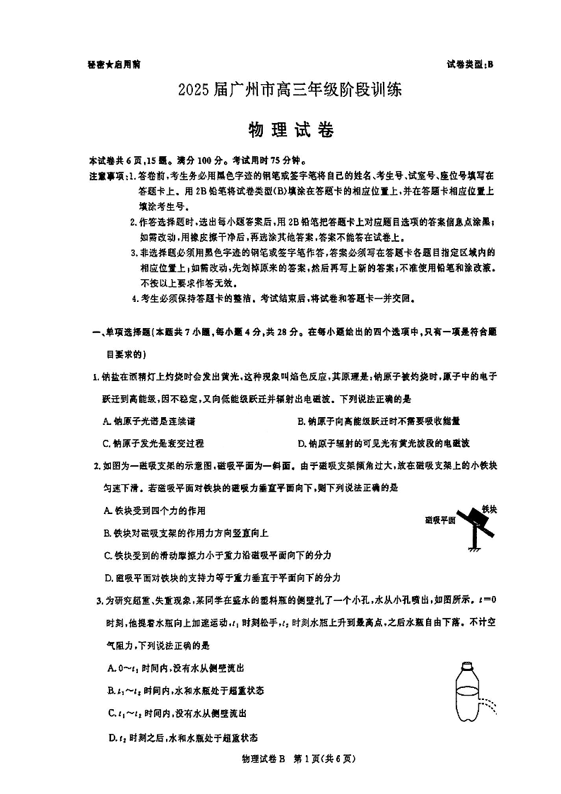 广东省2025届广州市高三年级阶段训练暨8月摸底考试(市调研考)物理