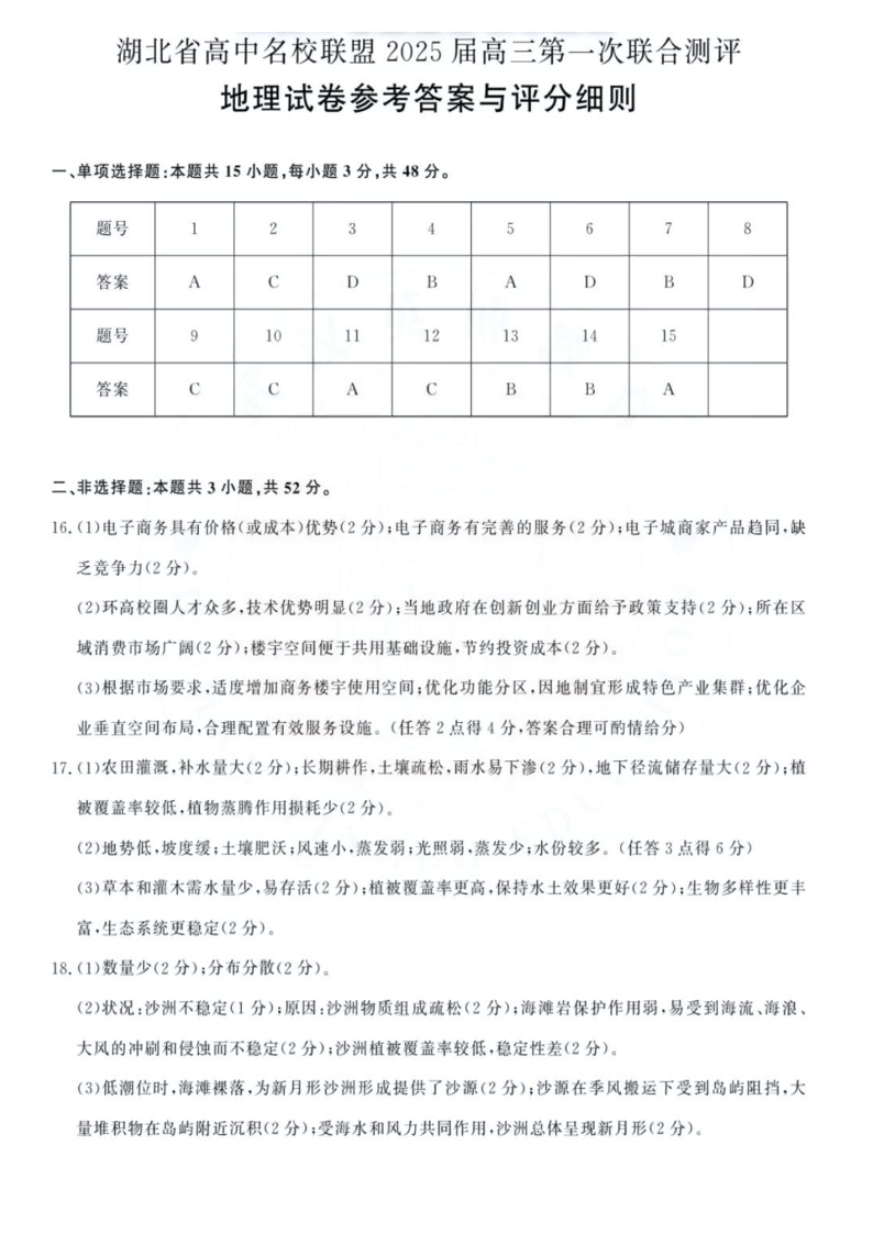 湖北省高中名校联盟2025届高三第一次联合测评 地理答案