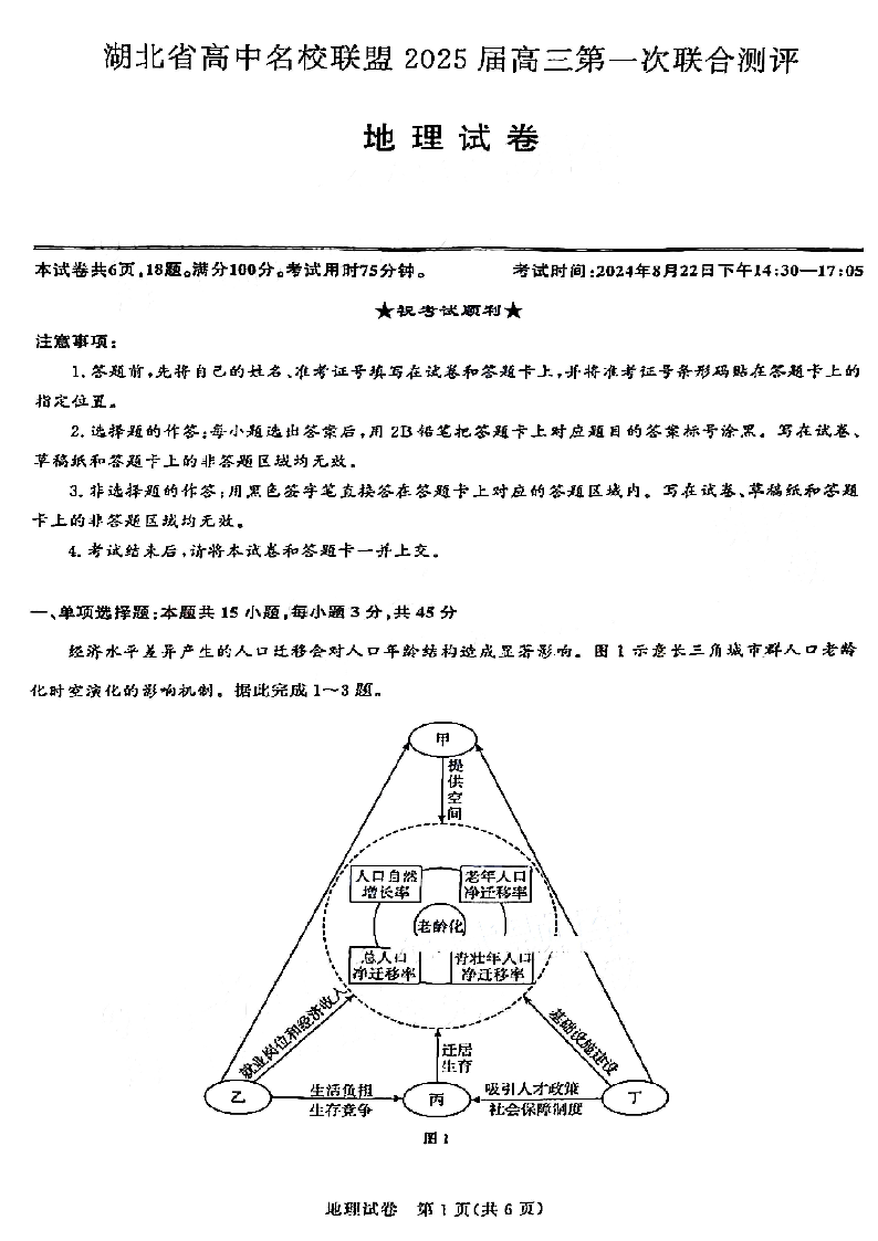 湖北省高中名校联盟2025届高三第一次联合测评 地理