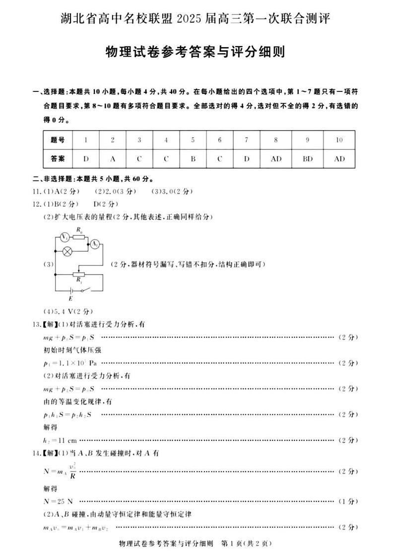 湖北省高中名校联盟2025届高三第一次联合测评 物理答案