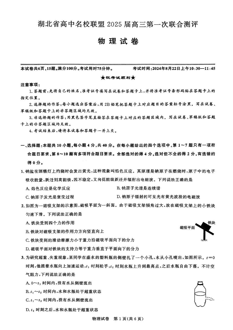 湖北省高中名校联盟2025届高三第一次联合测评 物理