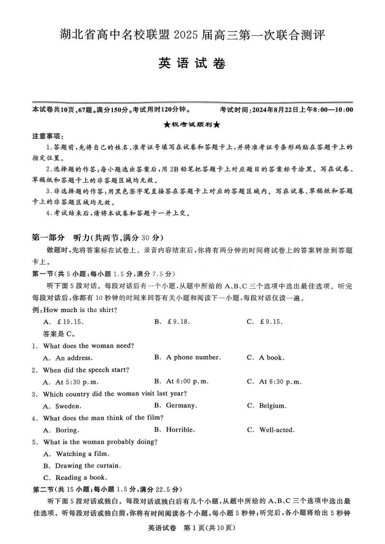 湖北省高中名校联盟2025届高三第一次联合测评 英语