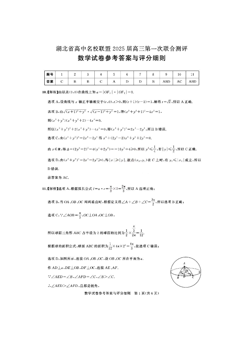 湖北省高中名校联盟2025届高三第一次联合测评 数学答案