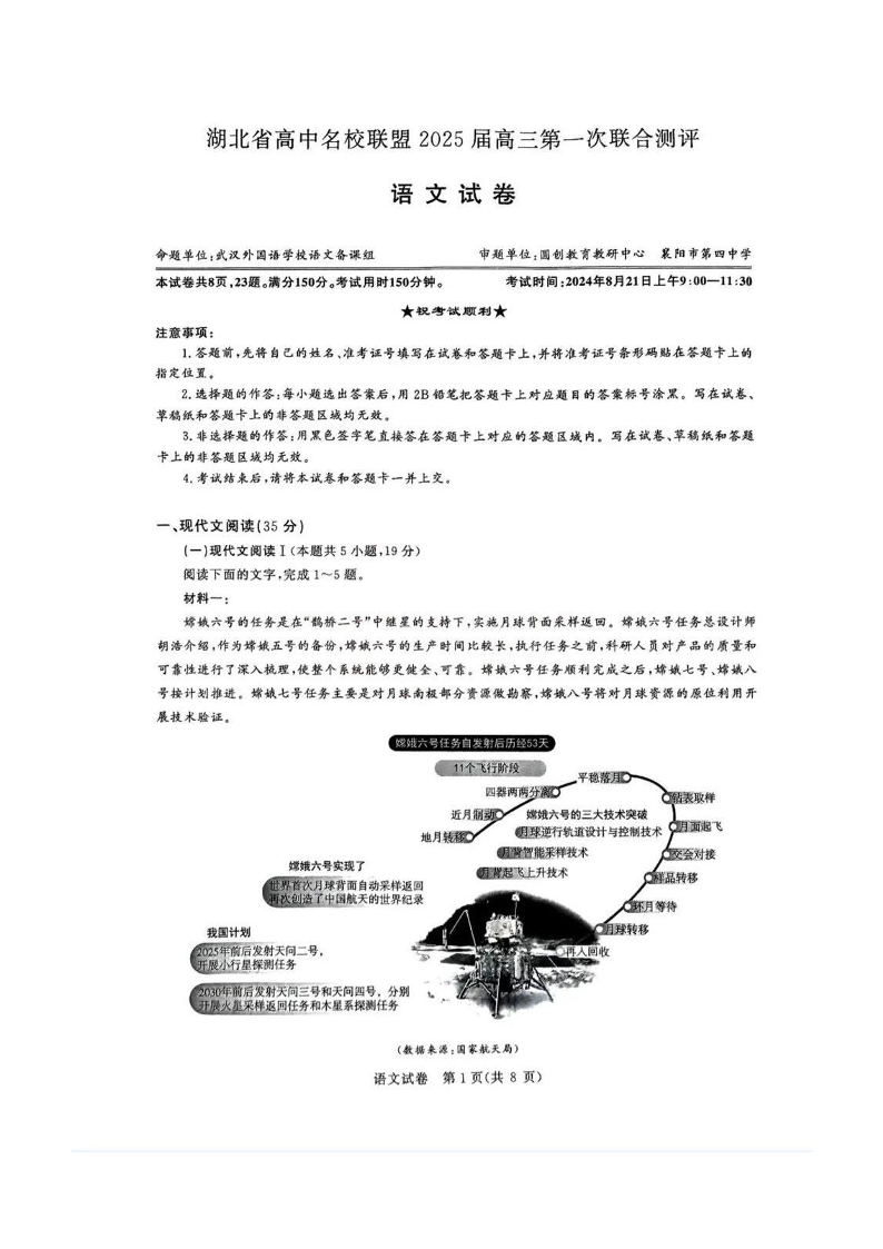 湖北省高中名校联盟2025届高三第一次联合测评 语文