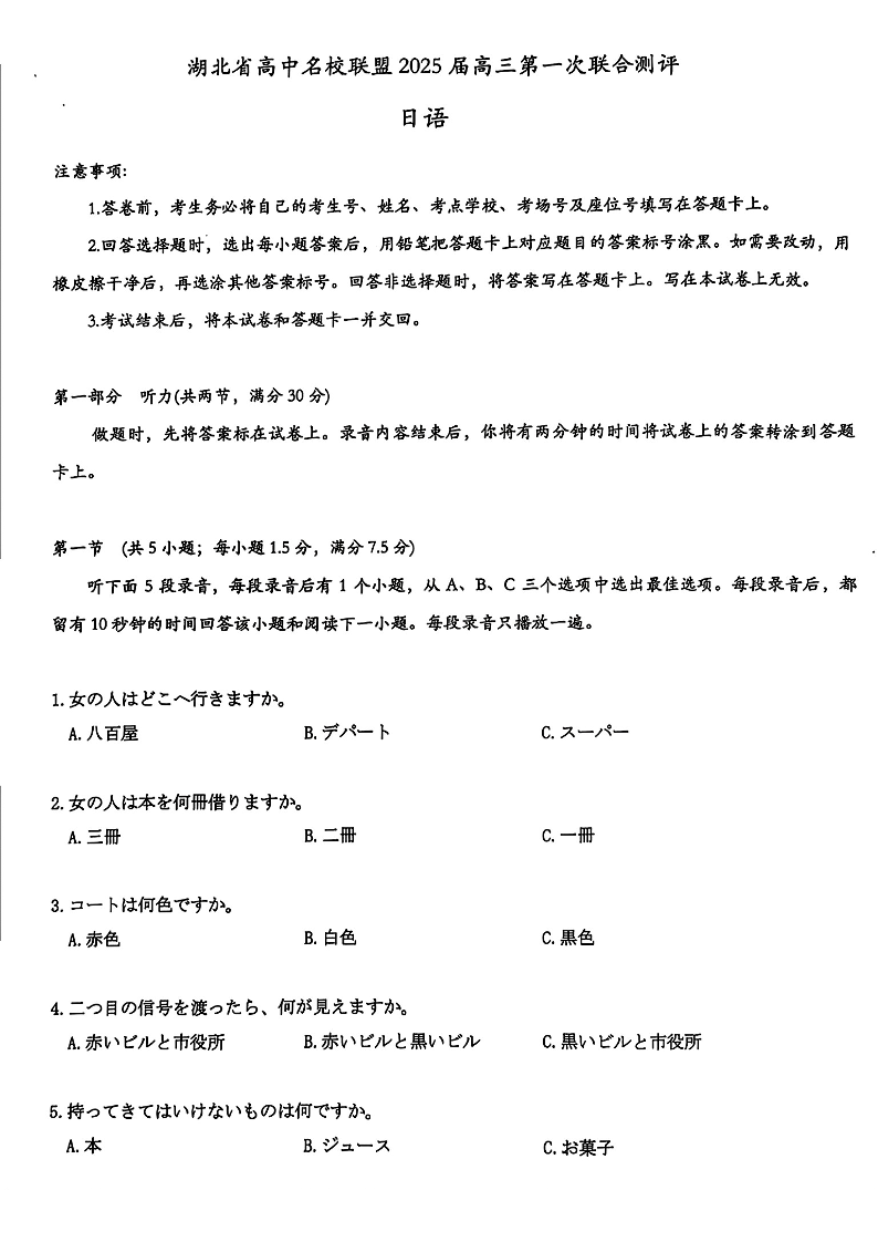 2025届湖北省高中名校联盟高三上学期第一次联合考试日语试题