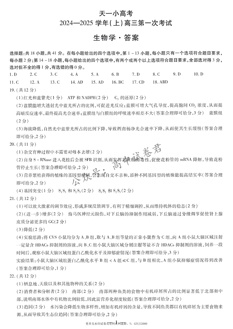 天一大联考2024-2025学年(上)高三第一次考试 生物答案