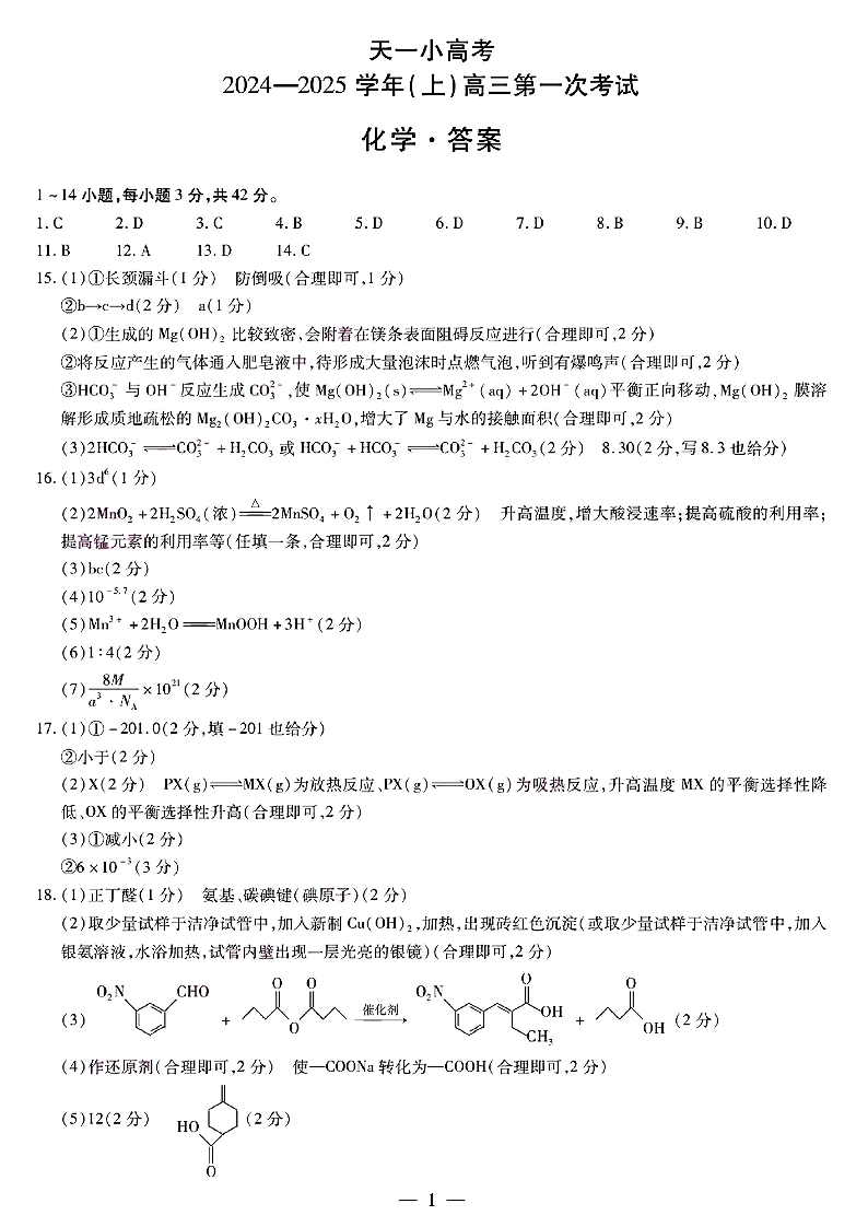 天一大联考2024-2025学年(上)高三第一次考试 化学答案