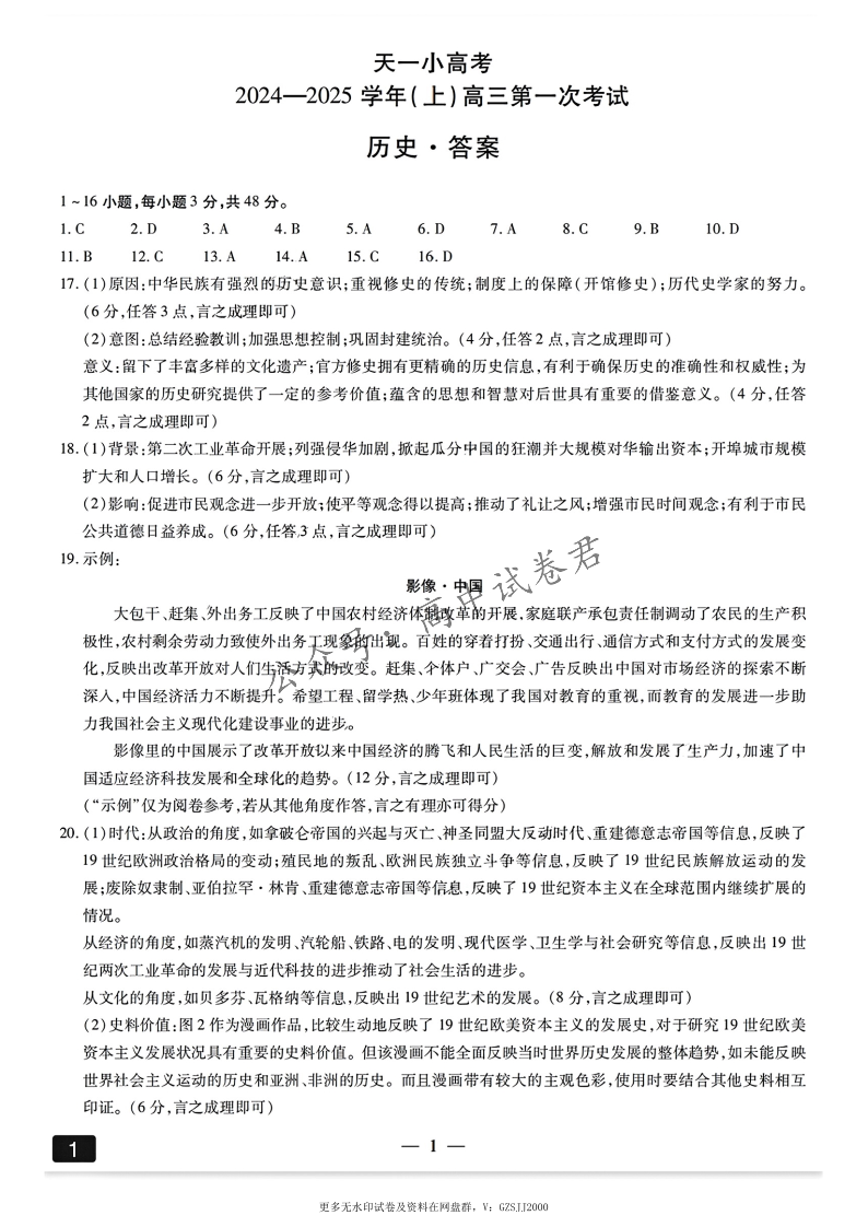天一大联考2024-2025学年(上)高三第一次考试 历史答案