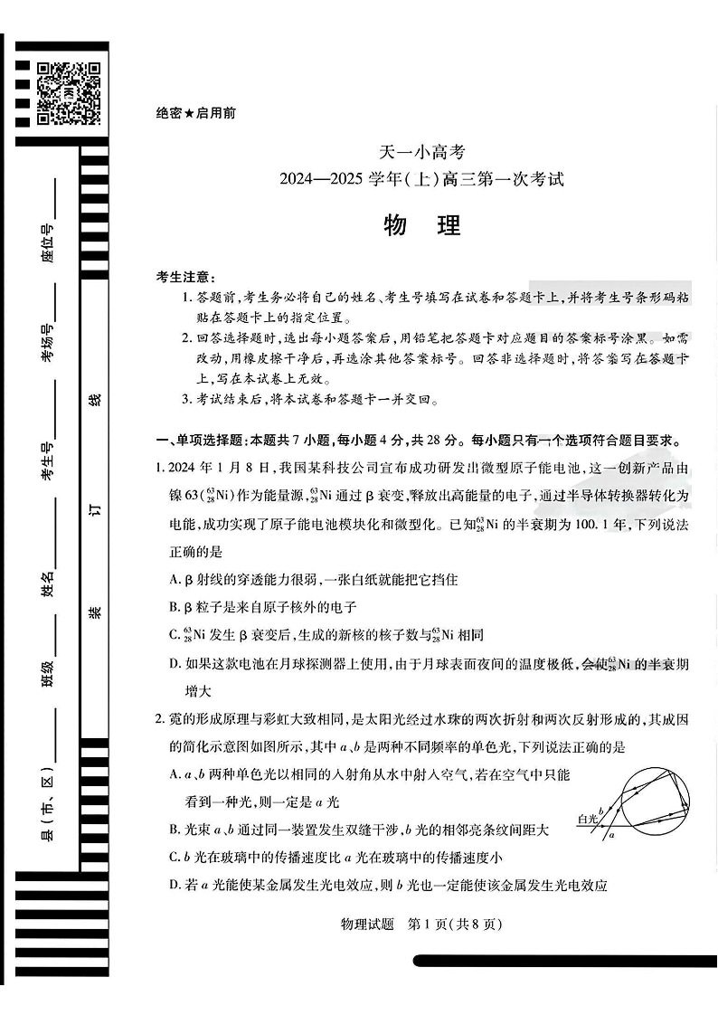 天一大联考2024-2025学年(上)高三第一次考试 物理