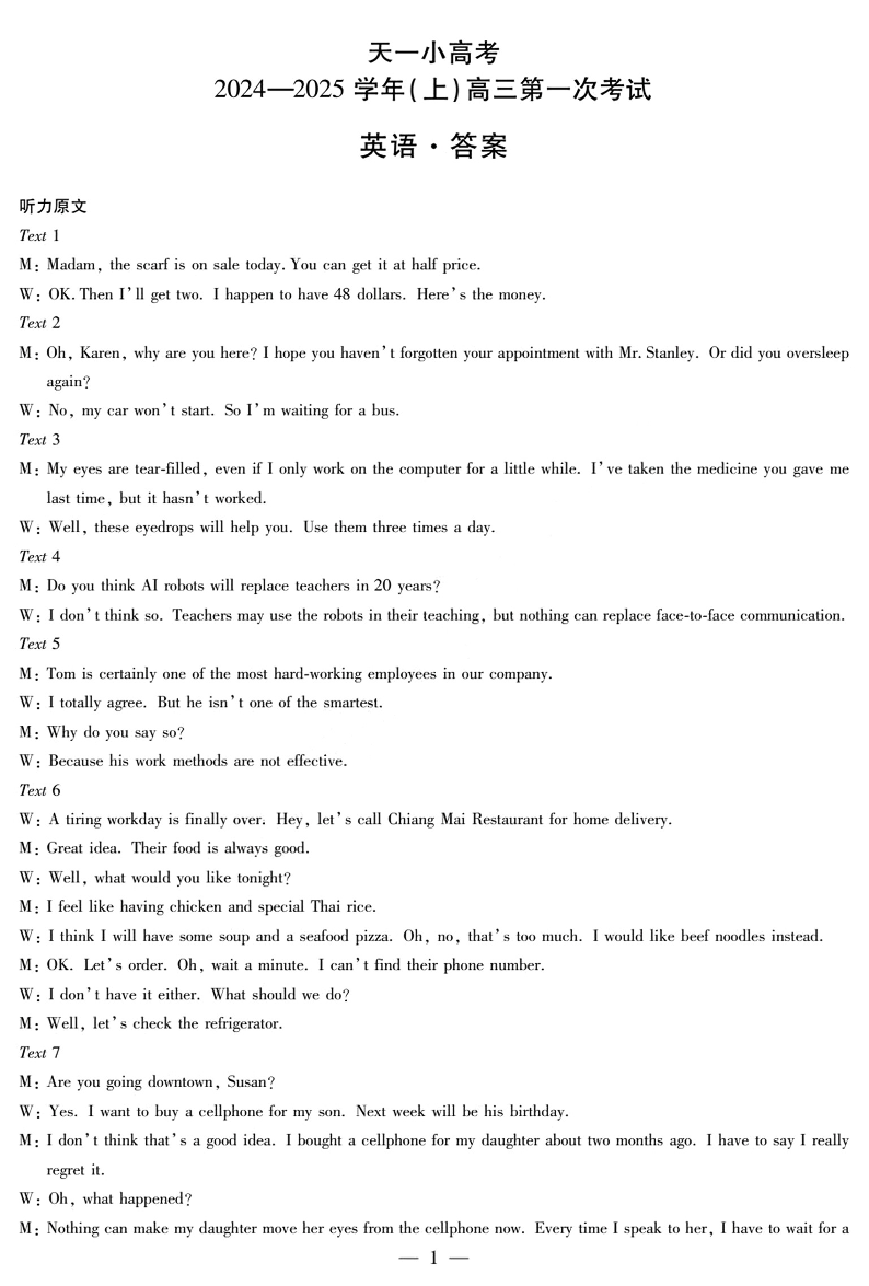 天一大联考2024-2025学年(上)高三第一次考试 英语答案