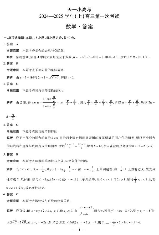 天一大联考2024-2025学年(上)高三第一次考试 数学答案