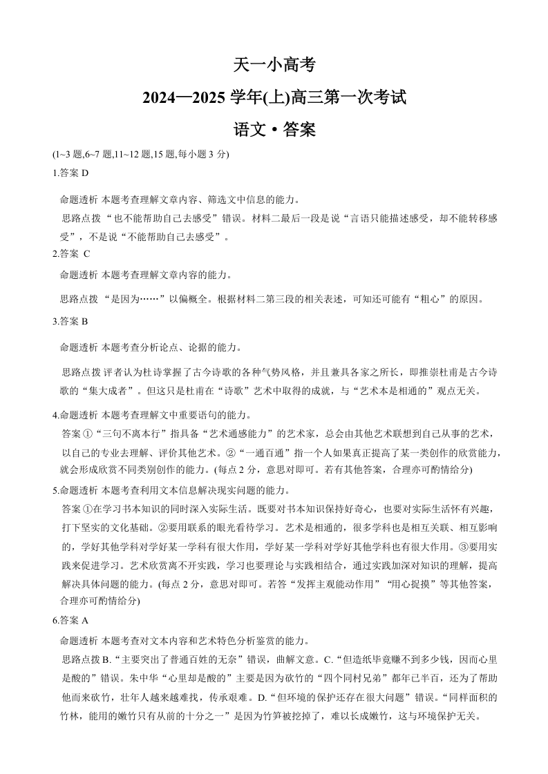 天一大联考2024-2025学年(上)高三第一次考试 语文答案