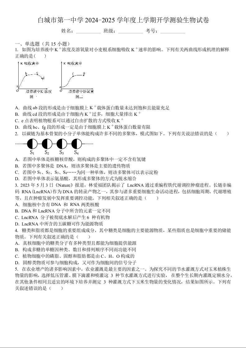 吉林省白城市洮北区白城市第一中学2024-2025学年高三上学期开学考试 生物