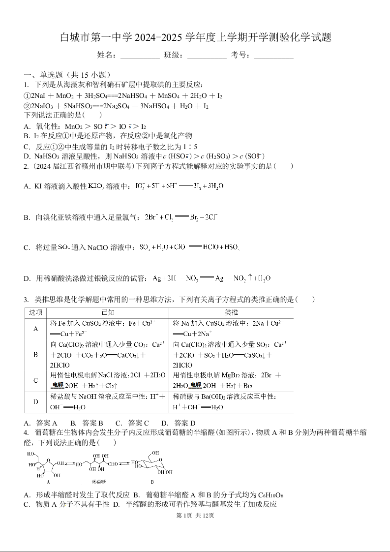 吉林省白城市洮北区白城市第一中学2024-2025学年高三上学期开学考试 化学