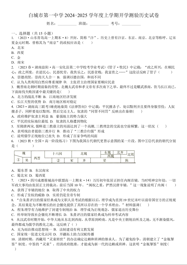 吉林省白城市洮北区白城市第一中学2024-2025学年高三上学期开学考试 历史