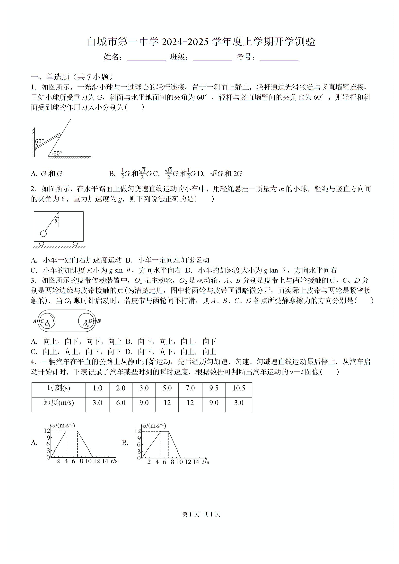 吉林省白城市洮北区白城市第一中学2024-2025学年高三上学期开学考试 物理