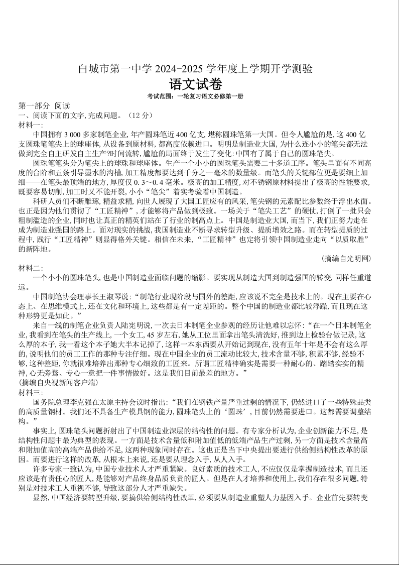 吉林省白城市洮北区白城市第一中学2024-2025学年高三上学期开学考试 语文