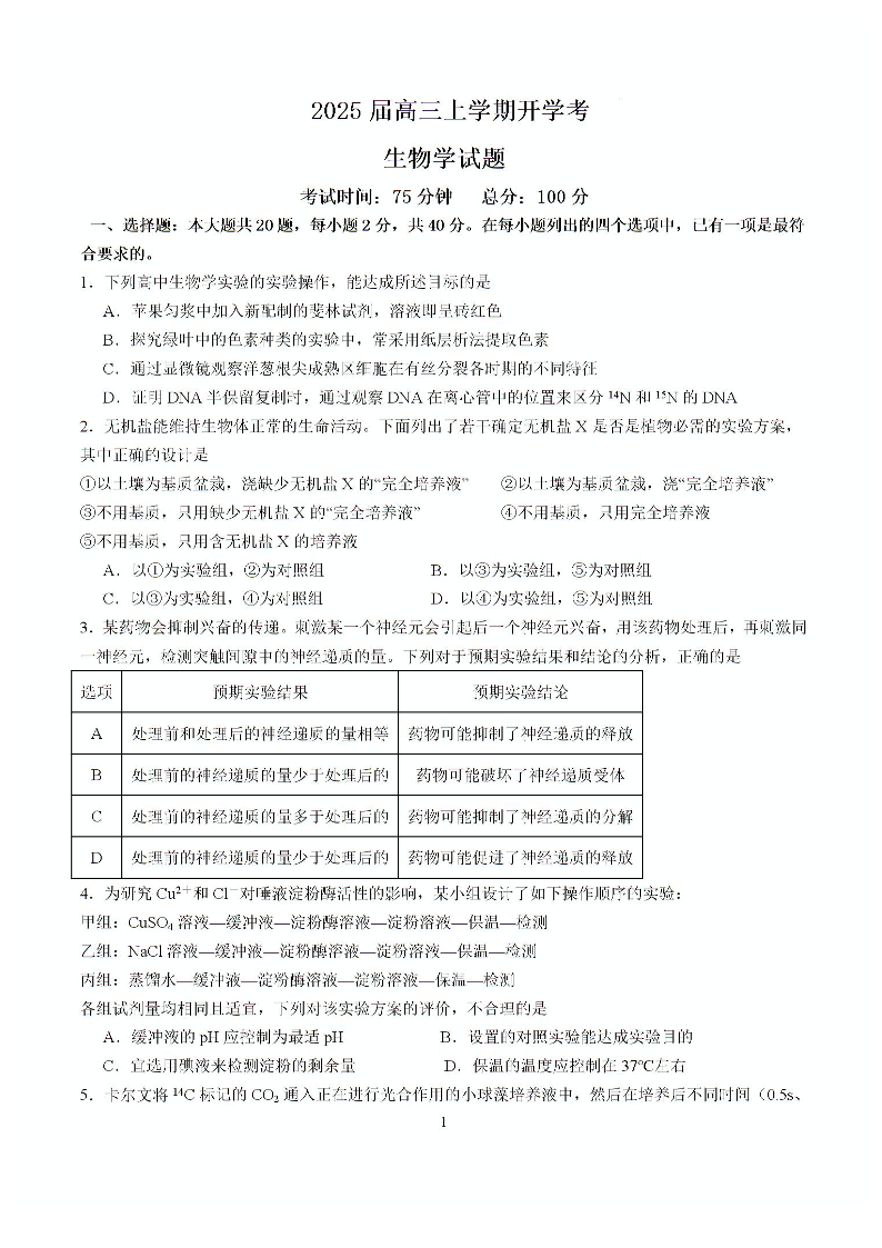 福建省龙岩市龙岩一中2025届高三上学期开学考试 生物