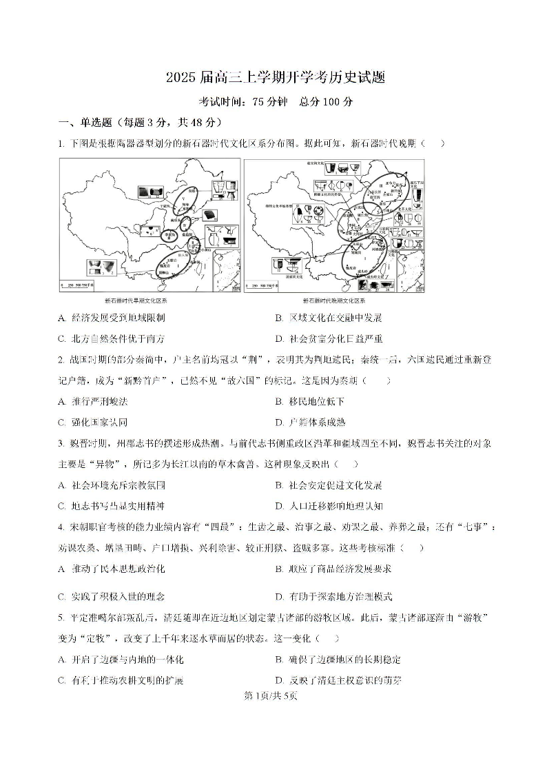 福建省龙岩市龙岩一中2025届高三上学期开学考试 历史