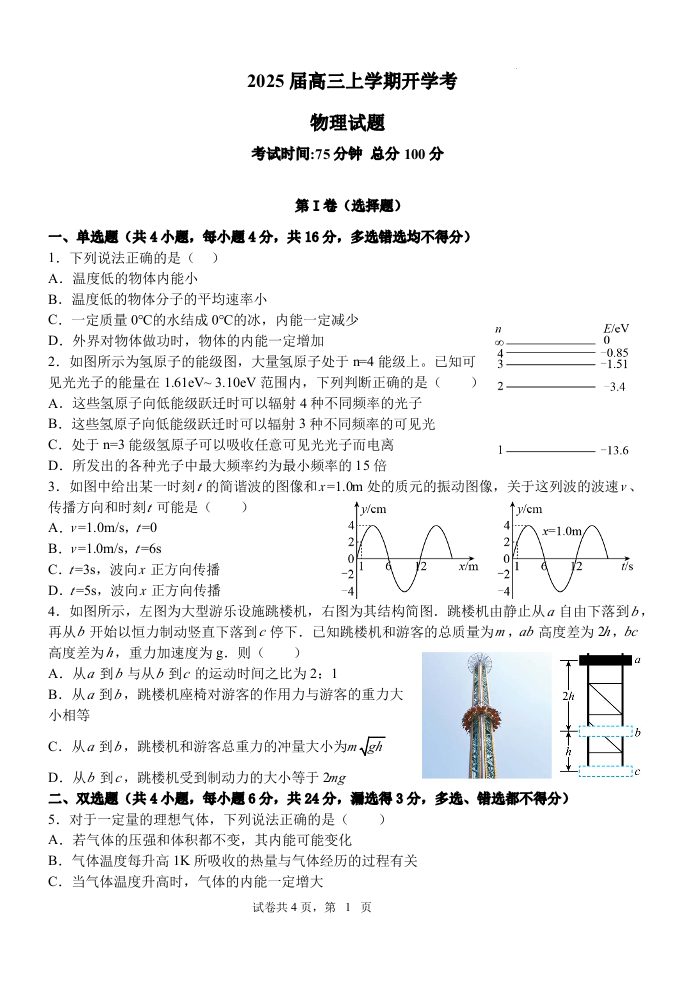 福建省龙岩市龙岩一中2025届高三上学期开学考试 物理