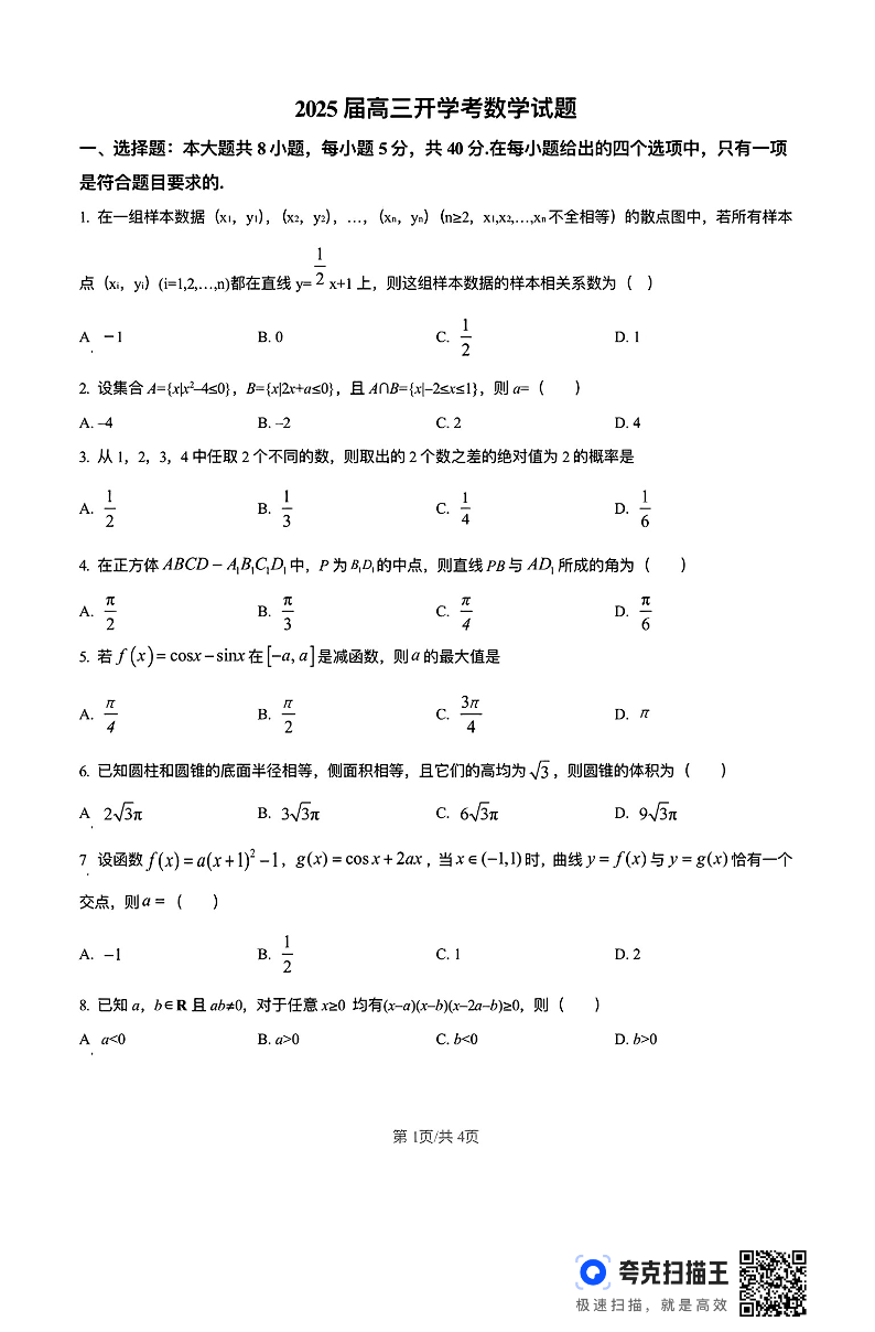 福建省龙岩市龙岩一中2025届高三上学期开学考试 数学