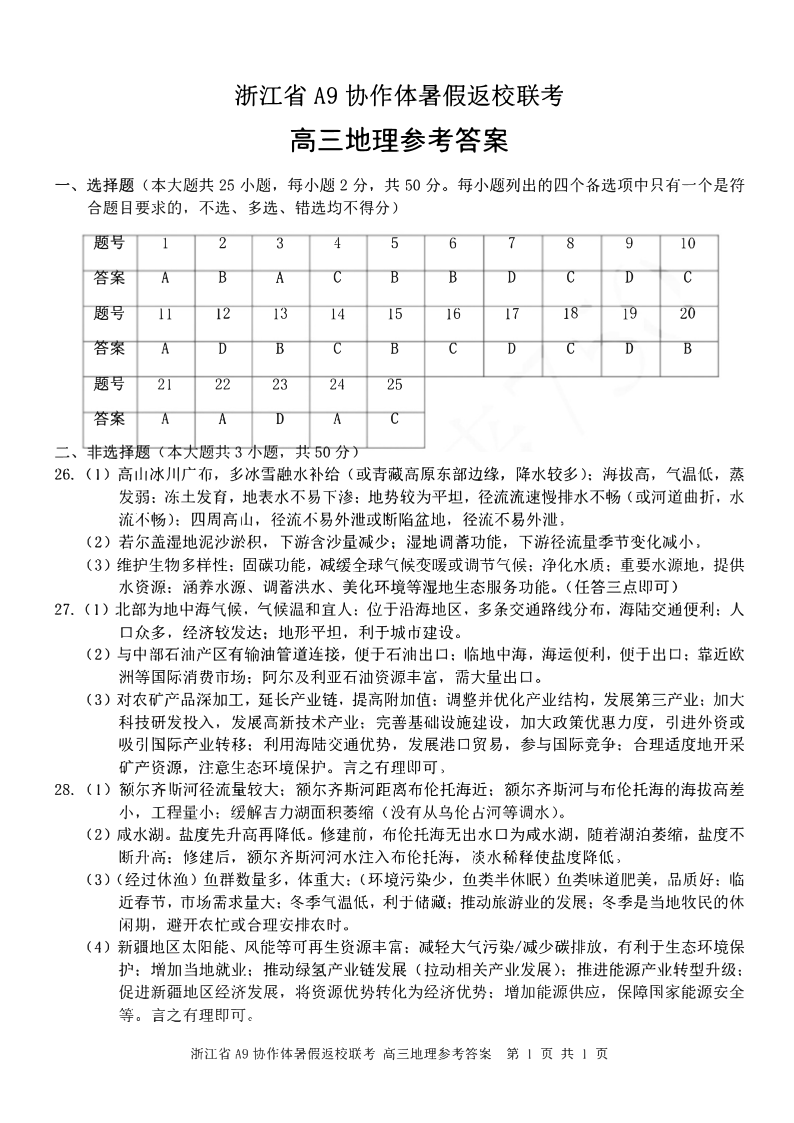 浙江省A9协作体2025届2024年8月高三年级八月暑期返校联考 地理答案