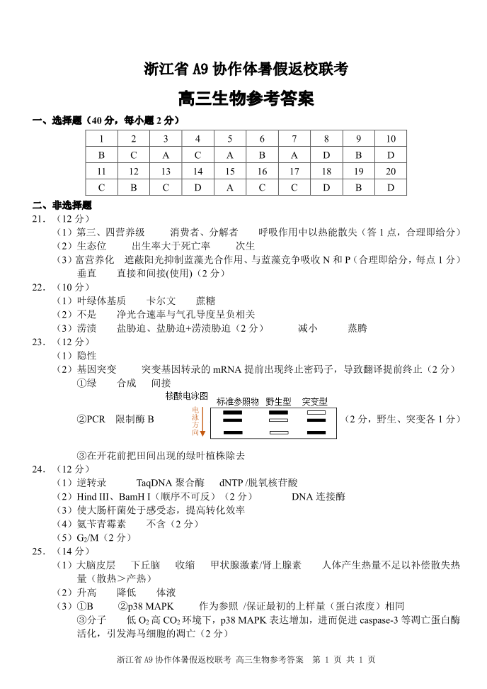 浙江省A9协作体2025届2024年8月高三年级八月暑期返校联考 生物答案