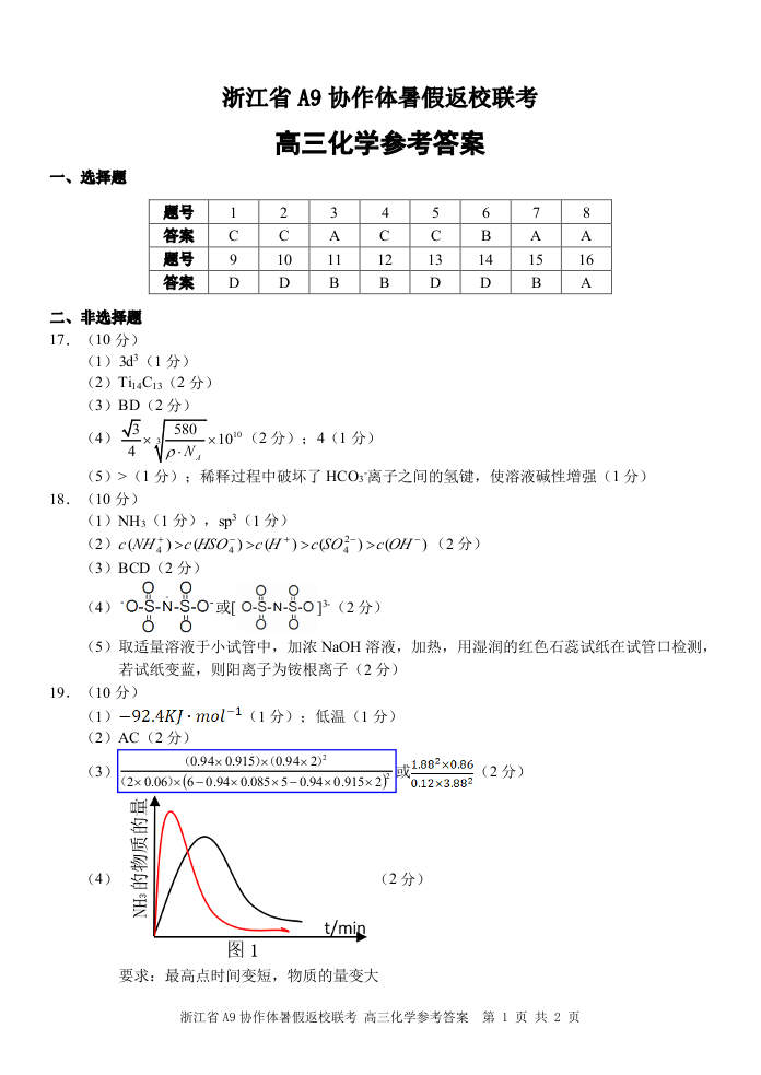 浙江省A9协作体2025届2024年8月高三年级八月暑期返校联考 化学答案