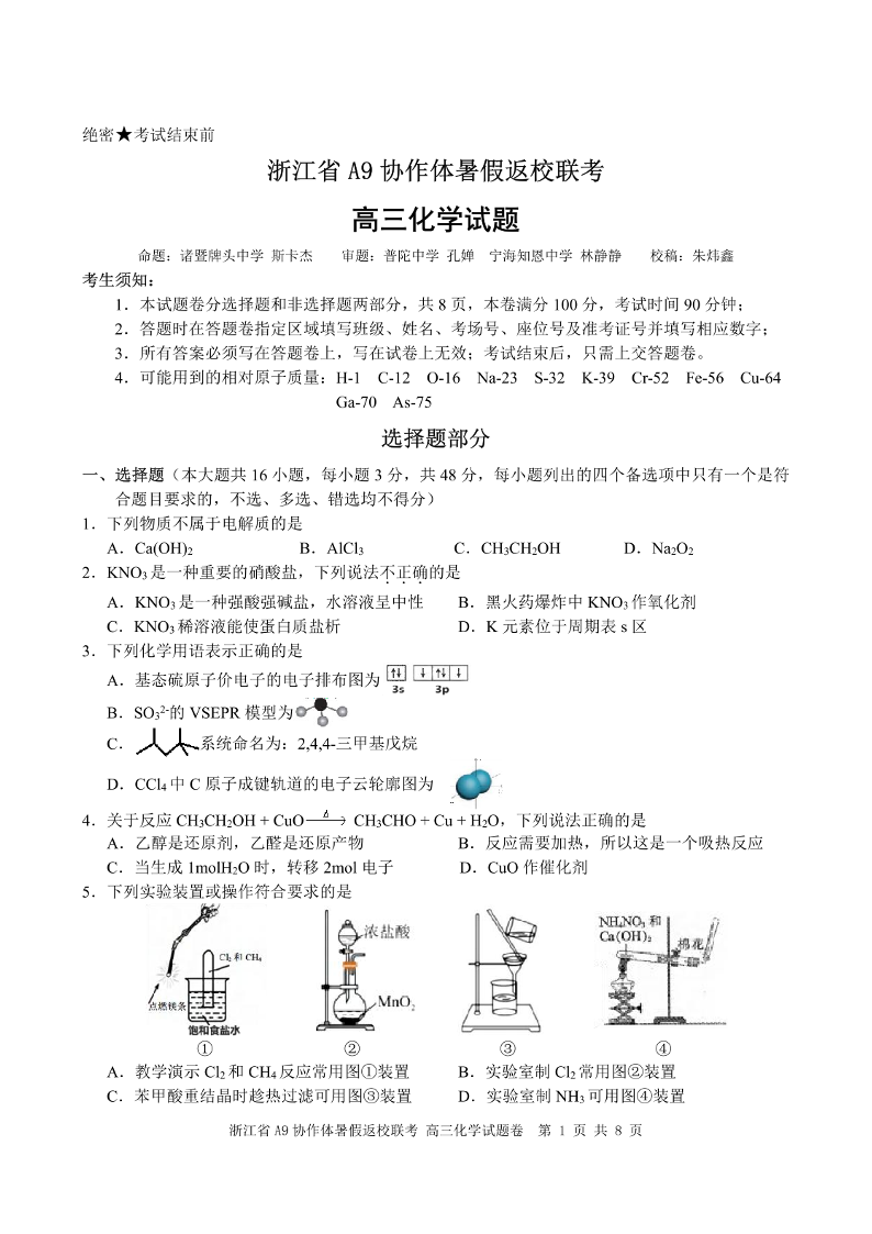 浙江省A9协作体2025届2024年8月高三年级八月暑期返校联考 化学