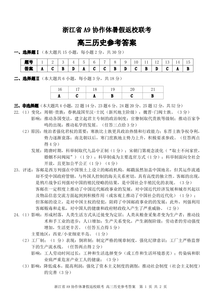 浙江省A9协作体2025届2024年8月高三年级八月暑期返校联考 历史答案