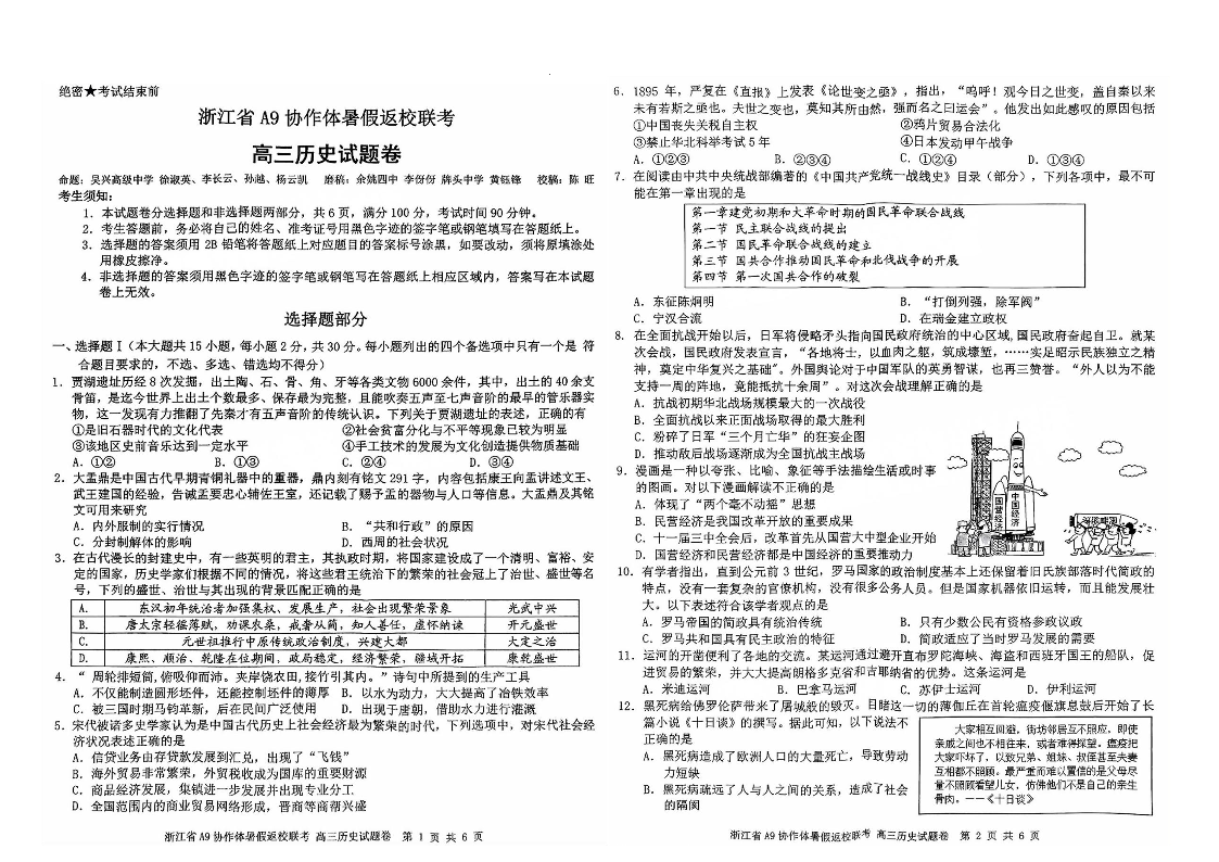 浙江省A9协作体2025届2024年8月高三年级八月暑期返校联考 历史