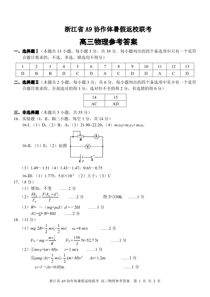 浙江省A9协作体2025届2024年8月高三年级八月暑期返校联考 物理答案