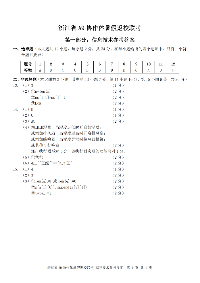 浙江省A9协作体2025届2024年8月高三年级八月暑期返校联考 技术试卷-信息技术答案