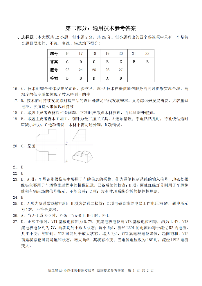 浙江省A9协作体2025届2024年8月高三年级八月暑期返校联考 技术试卷-通用技术答案