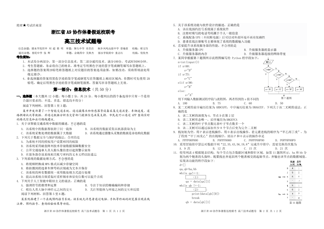 浙江省A9协作体2025届2024年8月高三年级八月暑期返校联考 技术