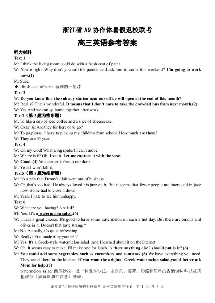 浙江省A9协作体2025届2024年8月高三年级八月暑期返校联考 英语答案