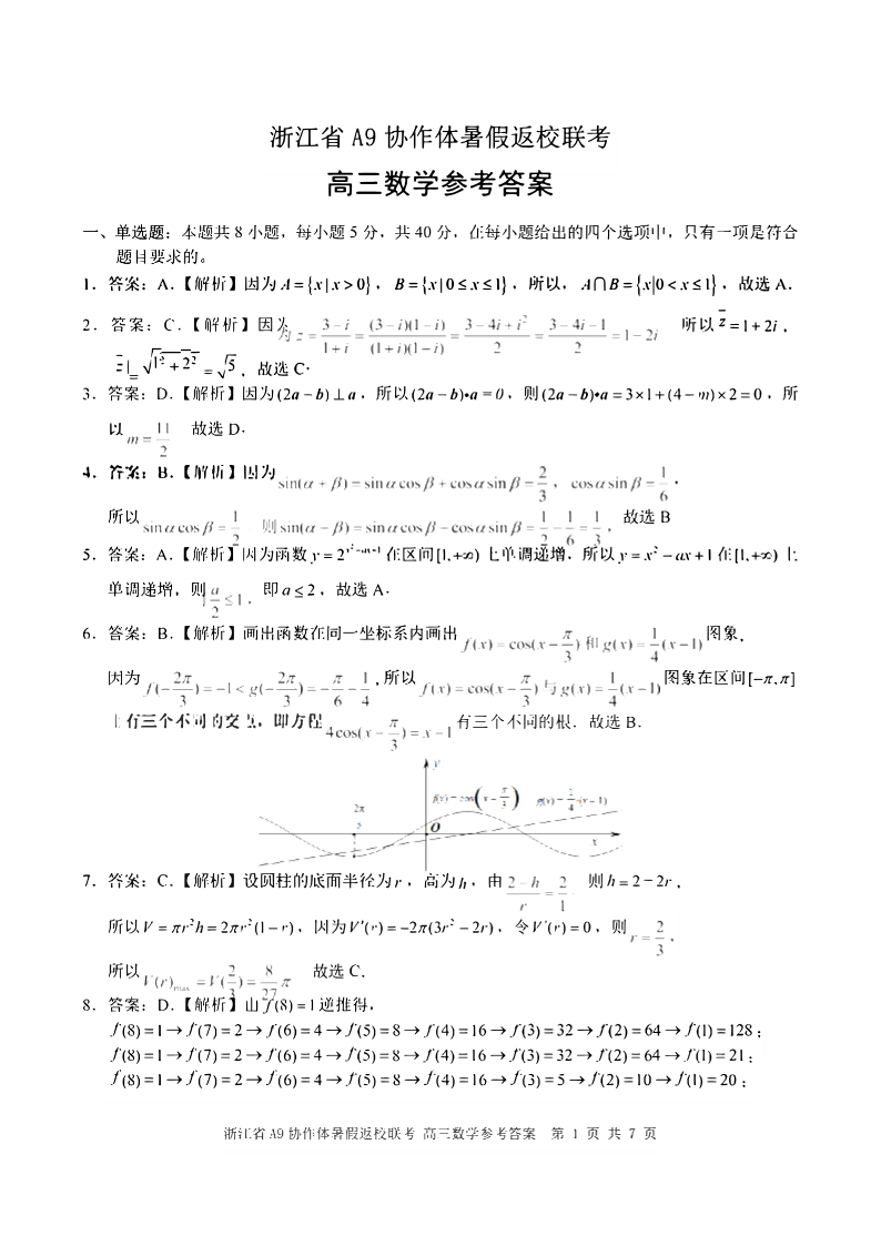浙江省A9协作体2025届2024年8月高三年级八月暑期返校联考 数学答案