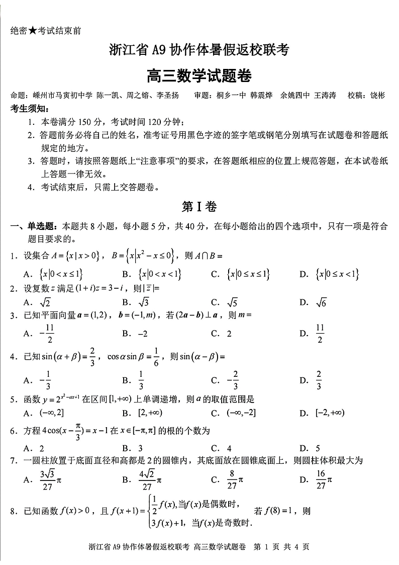浙江省A9协作体2025届2024年8月高三年级八月暑期返校联考 数学