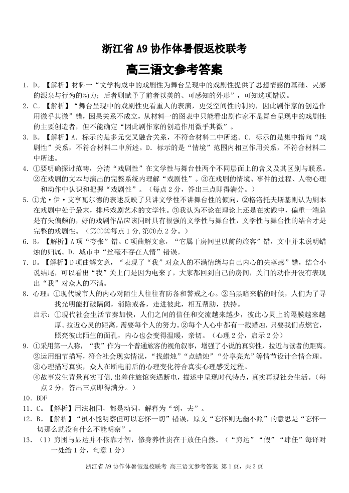 浙江省A9协作体2025届2024年8月高三年级八月暑期返校联考 语文答案