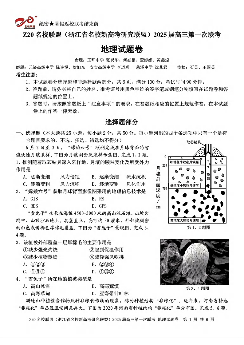 浙江省Z20名校联盟(浙江省名校新高考研究联盟)2025届高三第一次联考 地理