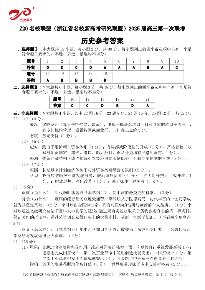 浙江省Z20名校联盟(浙江省名校新高考研究联盟)2025届高三第一次联考 历史答案