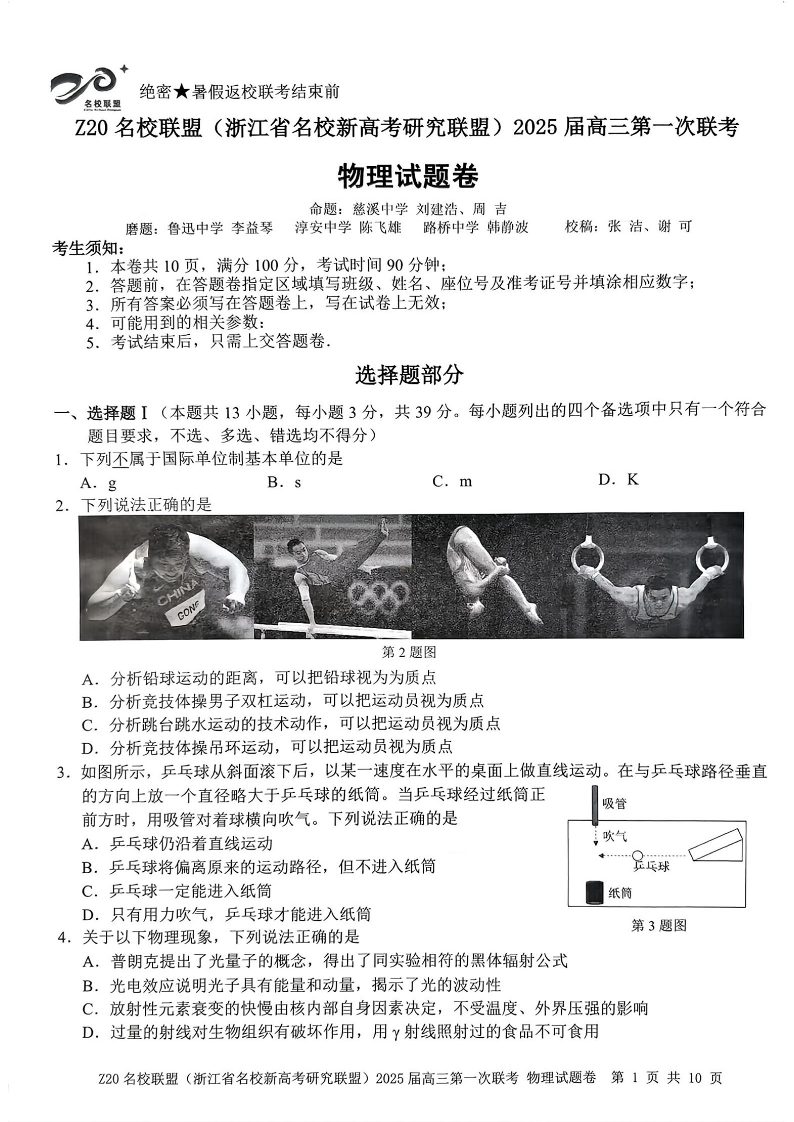 浙江省Z20名校联盟(浙江省名校新高考研究联盟)2025届高三第一次联考 物理