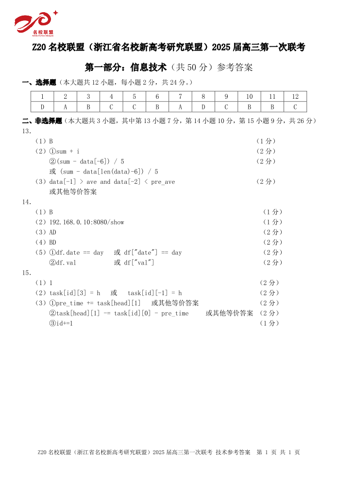 浙江省Z20名校联盟(浙江省名校新高考研究联盟)2025届高三第一次联考 技术答案